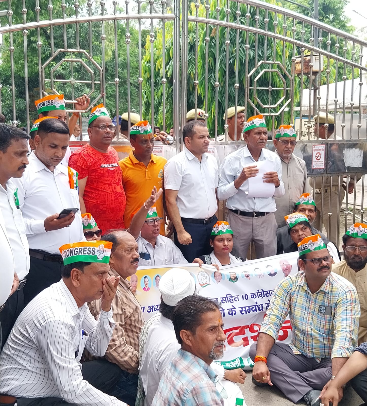 बरेली: उत्तर प्रदेश कांग्रेस कमेटी के आव्हान पर प्रदेश में मनमानी कानून व्यवस्था व कांग्रेसी नेताओं के विरुद्ध फर्जी मुकदमे दर्ज किए जाने के विरोध में आज कांग्रेस कमेटी के महानगर अध्यक्ष दिनेश दददा एड. के नेतृत्व में सैकड़ो कार्यकर्ताओं ने स्वर्गीय चौधरी चरण सिंह पार्क, कचहरी पर धरना - प्रदर्शन किया गया और बाद में कांग्रेस कार्यकर्ता जिला अधिकारी कार्यालय पहुंचे तो गेट बंद कर दिया गया, कार्यकर्ता गेट खुलवाने की जद्दोजहद करते रहे और गेट पर धरना देकर बैठ गए और जमकर नारेबाजी करते हुए प्रदर्शन किया। बाद में एससीएम महोदय ने आकर महामहिम को संबोधित ज्ञापन ले लिया, जिसे प्रदेश प्रवक्ता डॉ. कुलभूषण त्रिपाठी जी ने पढ़कर सुनाया ।