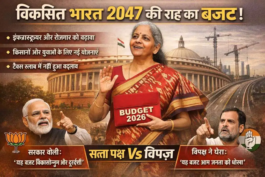 केंद्र सरकार ने आज संसद में वित्तीय वर्ष 2026-27 का आम बजट पेश कर देश की आर्थिक दिशा को लेकर अपने इरादे साफ कर दिए। केंद्रीय वित्त मंत्री निर्मला सीतारमण द्वारा प्रस्तुत यह बजट विकास, स्थिरता और भविष्य की तैयारी पर केंद्रित बताया गया है। सरकार का दावा है कि यह बजट विकसित भारत 2047 के सपने को साकार करने की मजबूत नींव रखेगा, जबकि विपक्ष ने इसे मध्यम वर्ग, गरीब और किसानों की उम्मीदों पर खरा न उतरने वाला करार दिया है।
