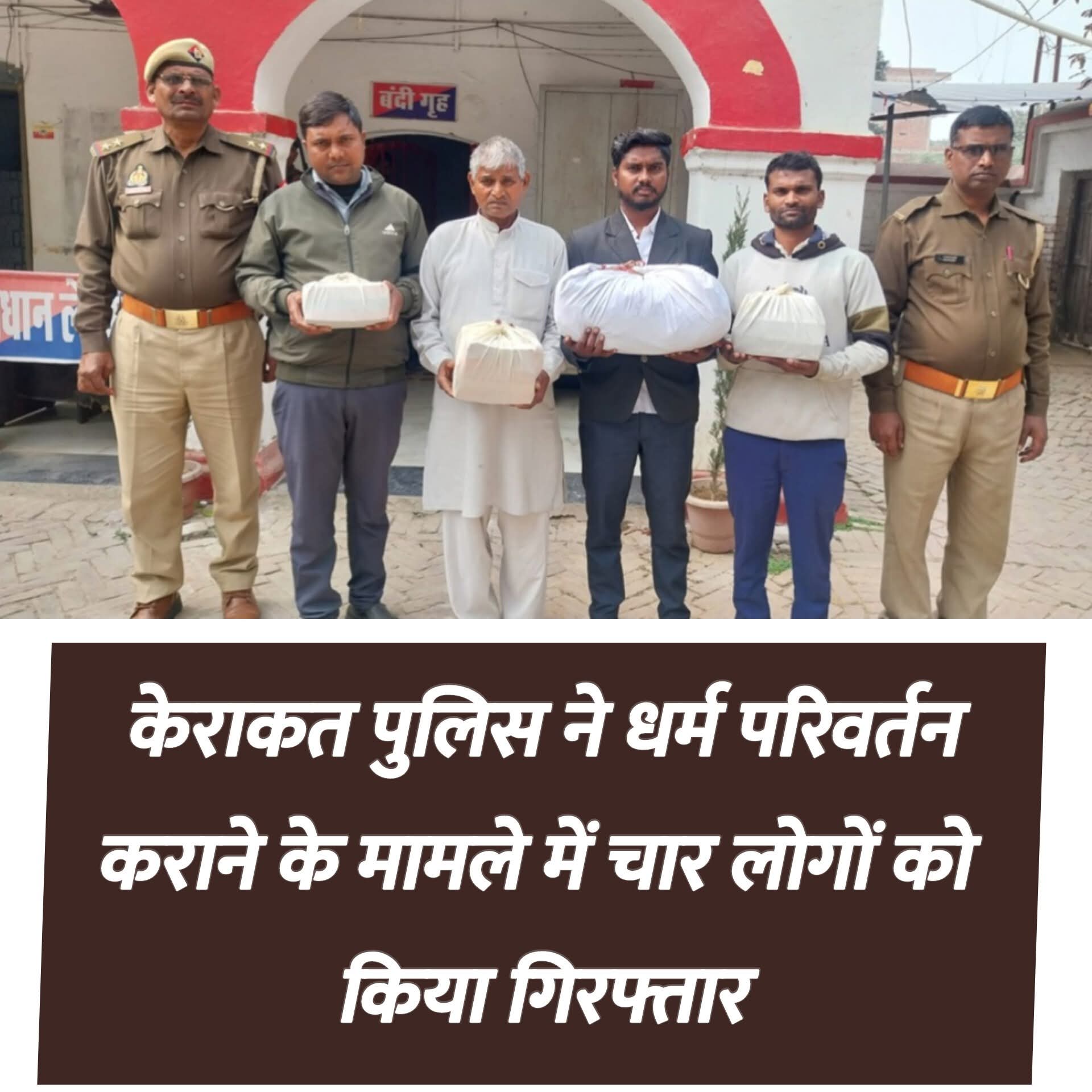 पुलिस के अनुसार थाना केराकत पर पंजीकृत मुकदमा संख्या 27/2026, धारा 3/5(1) उत्तर प्रदेश विधि विरुद्ध धर्म संपरिवर्तन प्रतिषेध अधिनियम के तहत त्वरित कार्रवाई करते हुए चारों अभियुक्तों को गिरफ्तार किया गया। सभी अभियुक्तों की गिरफ्तारी ग्राम तरियारी निवासी अजय कुमार के घर से की गई।