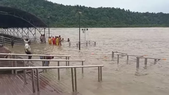 त्रिवेणी घाट में आरती स्थल शाम तक पानी में समा नजर आया