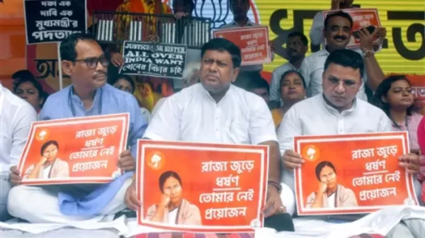 भाजपा कोलकाता में महिला डॉक्टर की जघन्य हत्या को लेकर बंगाल सरकार के खिलाफ आक्रामक हो गई है और अब मुख्यमंत्री ममता बनर्जी के इस्तीफे की मांग करते हुए पांच दिवसीय धरना शुरू कर दिया है। कलकत्ता हाई कोर्ट ने भाजपा को घटना के विरोध में पांच दिनों तक प्रदर्शन करने की अनुमति दी थी। पहले दिन बंगाल भाजपा के सभी बड़े नेता धरना में शामिल हुए।