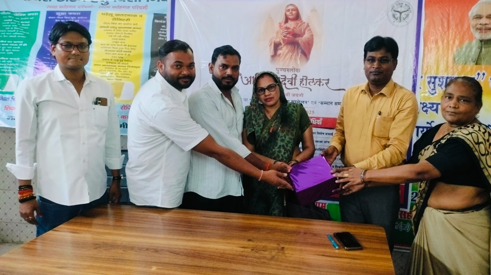 फतेहगंज पश्चिमी _ नगर विकास विभाग उत्तर प्रदेश के आदेश अनुसार आज गुरुवार को फतेहगंज पश्चिमी नगर पंचायत में रानी अहिल्याबाई होल्कर की तीन सौ वीं जयंती के अवसर पर महिला सभासदों एवं नगर पंचायत में कार्यक्रत महिला सफाई कर्मचारियों एवं कस्बे के 15 वार्डों की अन्य महिलाओं को अधिशासी अधिकारी शिवलाल राम एवं नगर पंचायत चेयरमैन इमराना बेगम ने सभी महिलाओं को सम्मानित कर पुरस्कार वितरण किये। इस मौके पर वरिष्ठ लिपिक बेला देवी, चेयरमैन पति मोहम्मद शाहिद उर्फ कल्लू भाई, सभासद श्रीमती गीता देवी, श्रीमती नसरीन अंसारी, श्रीमती शबीना बी, सभासद शराफत हुसैन, सभासद डॉक्टर मोइन उद्दीन अंसारी, प्रेम कोरी, मौलाना मोहम्मद अहसन अंसारी, चेयरमैन प्रतिनिधि हारून चौधरी, कॉन्ट्रैक्टर जगत सिंह उर्फ सनी, सुरेश सिंह, दिनेश सिंह, धर्मेंद्र सिंह, अबोध सिंह, ठेकेदार गौरव मिश्रा, मोहम्मद शफवान उर्फ रिंकू, मोहम्मद वसीम आदि नगर पंचायत स्टाफ एवं प्रमुख समाजसेवी कार्यक्रम में मौजूद रहे।