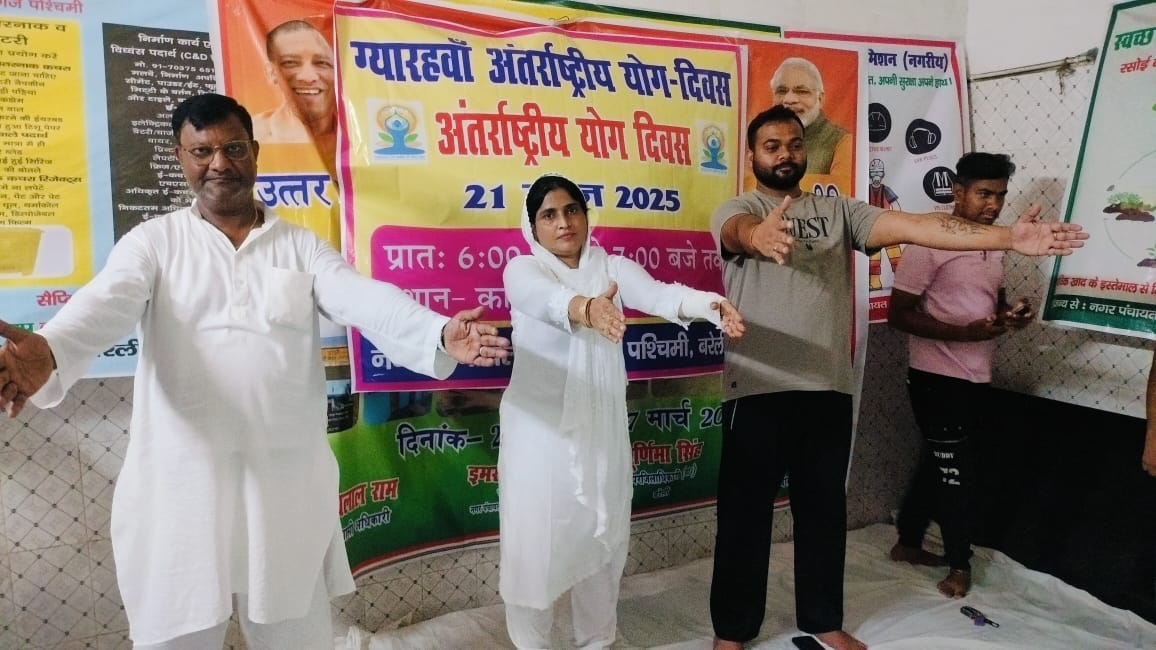 फतेहगंज पश्चिमी _ अंतरराष्ट्रीय योग दिवस पर नगर पंचायत फतेहगंज पश्चिमी में योग शिविर का आयोजन किया गया। योग शिविर में योग प्रशिक्षण जगदीश प्रसाद शर्मा ने चेयरमैन और नगर पंचायत स्टाफ एवं कर्मचारियों को कई प्रकार के योगासन करना सिखाया। और योग करने के लाभ के बारे में भी जानकारी दी। चेयरमैन इमराना बेगम ने बताया कि 11वें अंतर्राष्ट्रीय योग दिवस पर नगर पंचायत फतेहगंज पश्चिमी में हर वर्ष तरह योग दिवस पर शिविर का आयोजन किया गया। जिसमें नगर पंचायत स्टाफ एवं कर्मचारियों के साथ कस्बे के पुरुषों के साथ महिलाओं ने भी बढ़-चढ़कर हिस्सा लिया। और सभी ने कई प्रकार के योगासन किए। योग शिविर में वरिष्ठ लिपिक बेला देवी, चेयरमैन पति मोहम्मद शाहिद उर्फ कल्लू भाई, सभासद शराफत हुसैन, सभासद प्रेम कुमार कोरी, सतीश महेश्वरी, कृपाल सिंह, डॉक्टर मोइन उद्दीन अंसारी, जगदीश प्रसाद शर्मा, जयप्रकाश, चेयरमैन प्रतिनिधि हारून चौधरी, जगत सिंह उर्फ सनी, डॉक्टर मुदित प्रताप सिंह, सुरेश सिंह, दिनेश सिंह, मिट्टी भाई, रवि सैनी, जुनैद, फईम अली, रमन बाबू, विजय कुमार, विशाल बाबू, गौरव श्रीवास्तव, सोमपाल यादव आदि नगर पंचायत स्टाफ और कस्बे के लोग मौजूद रहे। और सभी ने मिलकर योगासन किया।