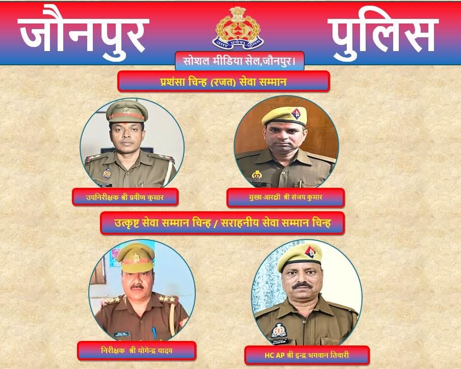 जौनपुर: गणतंत्र दिवस–2026 के अवसर पर जनपद जौनपुर के चार पुलिस अधिकारी/कर्मचारियों को उनके उत्कृष्ट कार्य, कर्तव्यनिष्ठा और सेवा भावना के लिए सम्मानित किया जाएगा। पुलिस महानिदेशक, उत्तर प्रदेश द्वारा सेवा अभिलेख व शौर्य/ऑपरेशनल कार्यों में उल्लेखनीय योगदान के आधार पर यह चयन किया गया है।