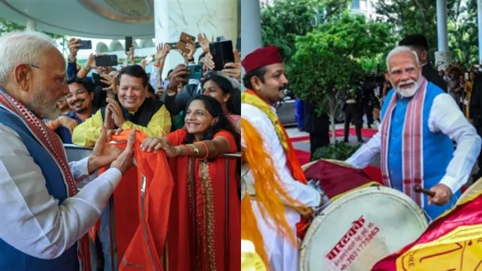 इससे पहले भारतीय समुदाय के लोगों ने मोदी का भव्य स्वागत किया। इससे पहले पीएम मोदी ने भी ढोल बजाया। पीएम मोदी के स्वागत में आए कलाकारों ने ढोल की धुन पर नृत्य किया।