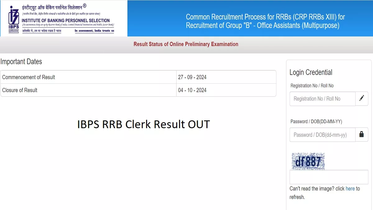 आईबीपीएस ऑफिस असिस्टेंट (मल्टीपर्पस)/ IBPS RRB Clerk प्रीलिम एग्जाम रिजल्ट का इंतजार खत्म हो गया है। इंस्टीट्यूट ऑफ बैंकिंग पर्सोनेल सिलेक्शन (IBPS) की ओर से आज यानी 27 सितंबर को आईबीपीएस क्लर्क का रिजल्ट जारी किया गया है। परीक्षार्थी तुरंत ही अपना रिजल्ट आईबीपीएस की ऑफिशियल वेबसाइट पर जाकर या इस पेज पर दिए डायरेक्ट लिंक से चेक कर सकते हैं। स्कोरकार्ड डाउनलोड करने के लिए उम्मीदवारों को रजिस्ट्रेशन नंबर/ रोल नंबर एवं पासवर्ड/ डेट ऑफ बर्थ दर्ज करना होगा।