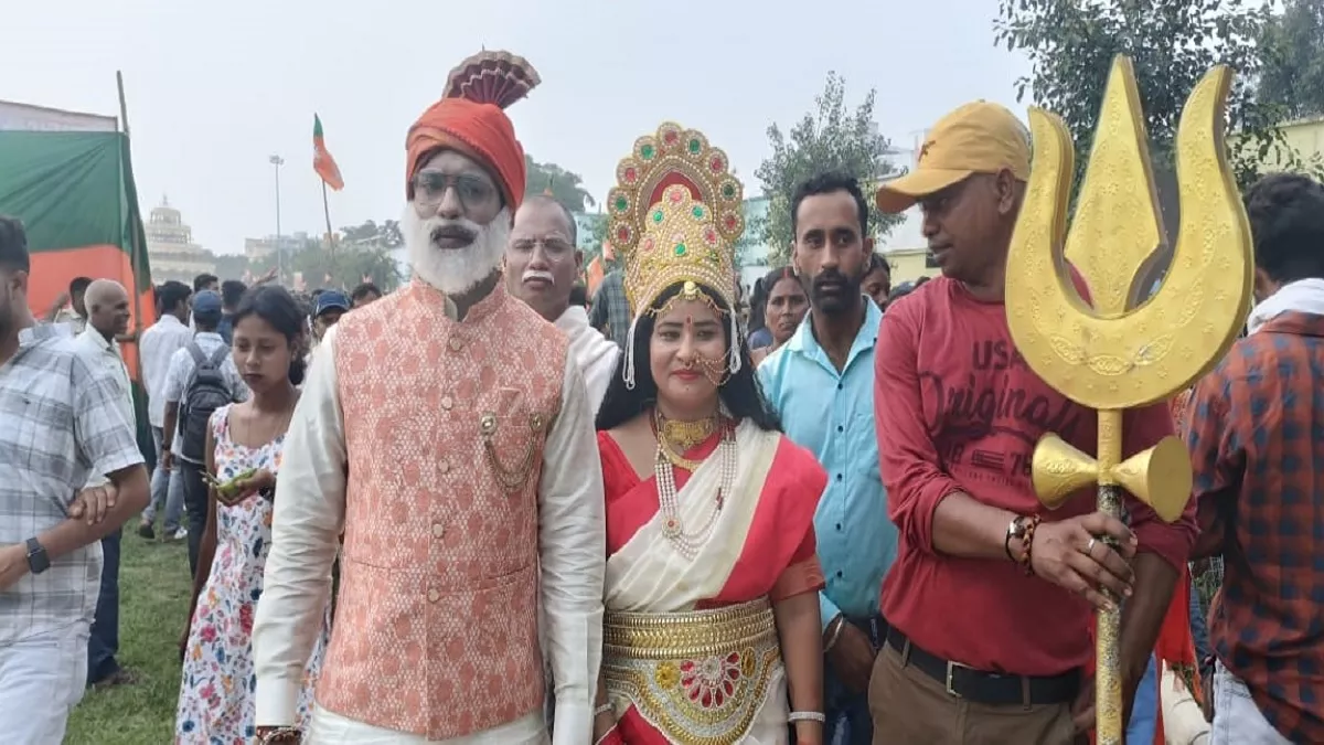 गांधी मैदान में आयोजित पीएम मोदी की सभा में भाजपा कार्यकर्ता मोदी के हमशक्ल और भारत माता के रूप में पहुंचे थे। पूरे सभा के दौरान दूर-दराज से आए लोग दोनों के साथ सेल्फी लेते दिखाई दिए।