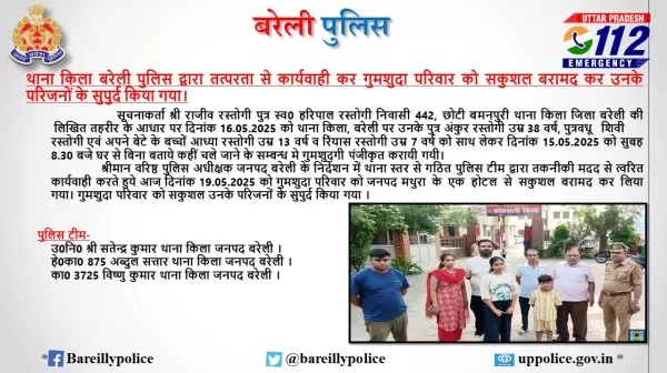 थाना किला बरेली पुलिस द्वारा तत्परता से कार्यवाही कर गुमशुदा परिवार को सकुशल बरामद कर उनके परिजनों के सुपुर्द किया